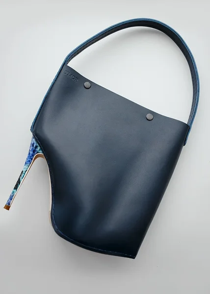 Handcrafted blue leather handbag with a printed heel from the"sole-mate project" (EXCLUSIVE)